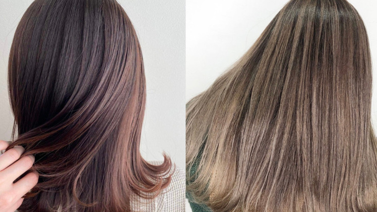 やわらかい透け感のあるダークグレージュで、暗髪でも重たく見えない洗練された印象に。