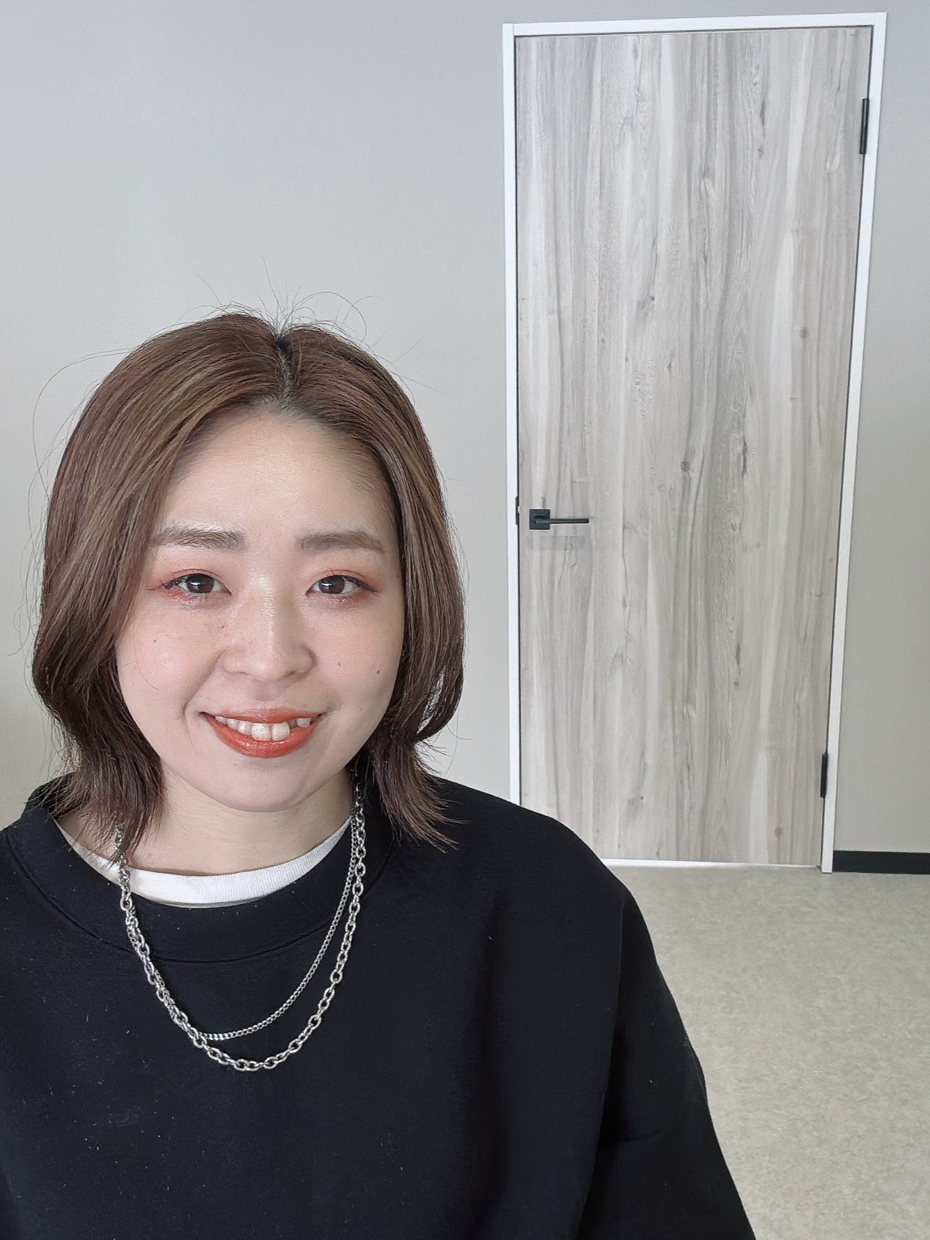 やわらかい透け感のあるダークグレージュで、暗髪でも重たく見えない洗練された印象に。